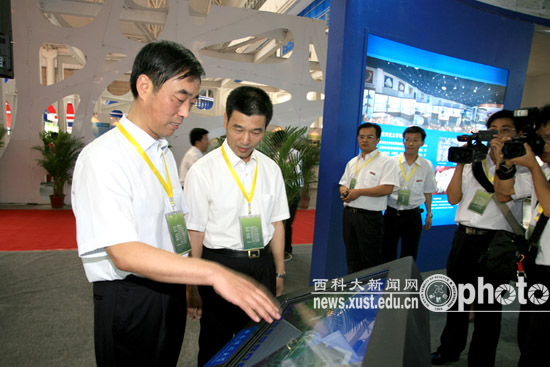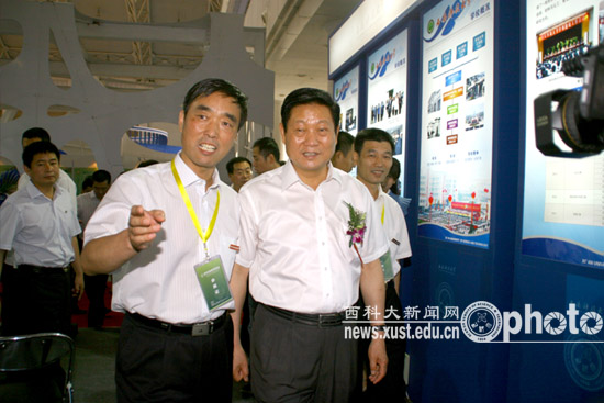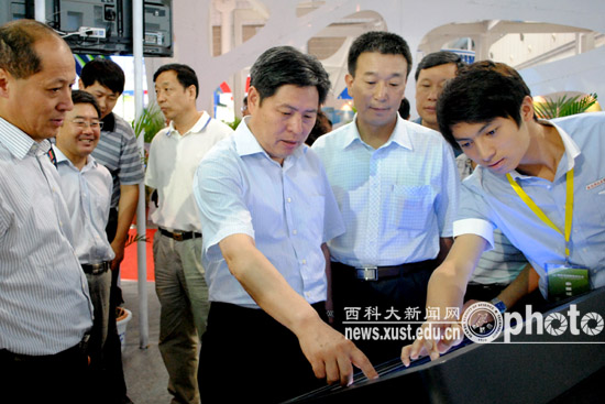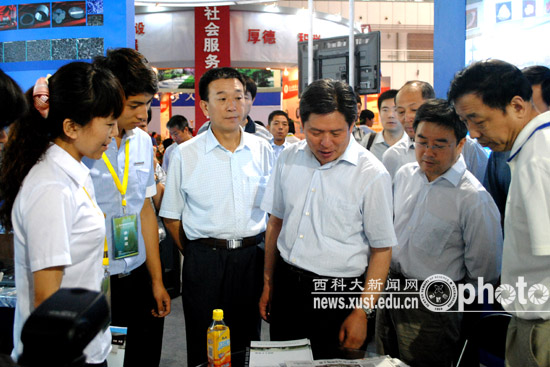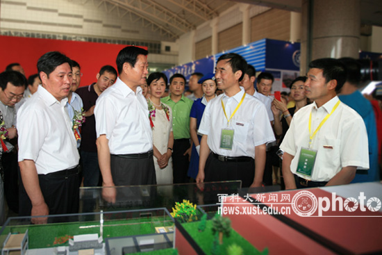 开幕仪式结束后,省委副书记、省长赵正永,省委副书记、省委教育工委书记王侠等领导兴致勃勃地参观了展览。在我校展区,校长苏三庆向赵正永一行介绍了我校的历史沿革、发展状况、教学及科研创新发明成果、社会服务等方面的情况。省长赵正永等领导饶有兴趣地观看了我校科技创新成果——KTE5矿山救援可视化指挥装置、SiC系列高科技产品、部分机电产品和我校学生在第四届国际建筑设计大赛荣获金奖的《褪晕——城市边缘地区建筑工人住区》模型,希望我校继续保持特色,为地矿行业及区域经济与社会发展做出更大贡献。