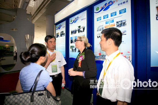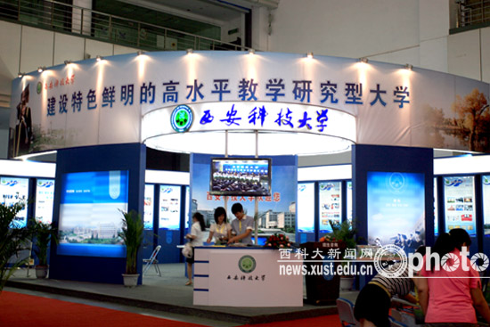 我校展位位于曲江国际展览中心A区,采用特型展位形式,布局大气,主题鲜明,凸显了我校的精神和风貌。展览由文字图片展示区、数字图像播放区、创新成果实物展示区和咨询服务区等四部分组成,展览从学校概况、学科建设、人才培养、科学研究、社会服务、党的建设、学校建设、国际交流、校园文化、后勤保障等10个方面展示了我校的建设成就。